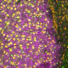 The image shows a brain section of the mouse amygdala. Using fluorescent markers, the expression of synapses is shown in purple, while neurons are shown as red dots and the microRNA miR-483-5p is shown as green dots.