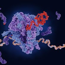 Artist’s rendition of the molecular structure of a ribosome (blue and purple) as it produces a polypeptide chain (red) from an mRNA template (orange and gray), with tRNA molecules (dark purple) shuttling amino acids.