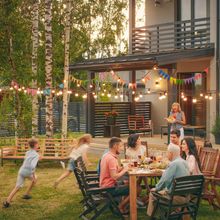 multiple generations of family members eating at outdoor table