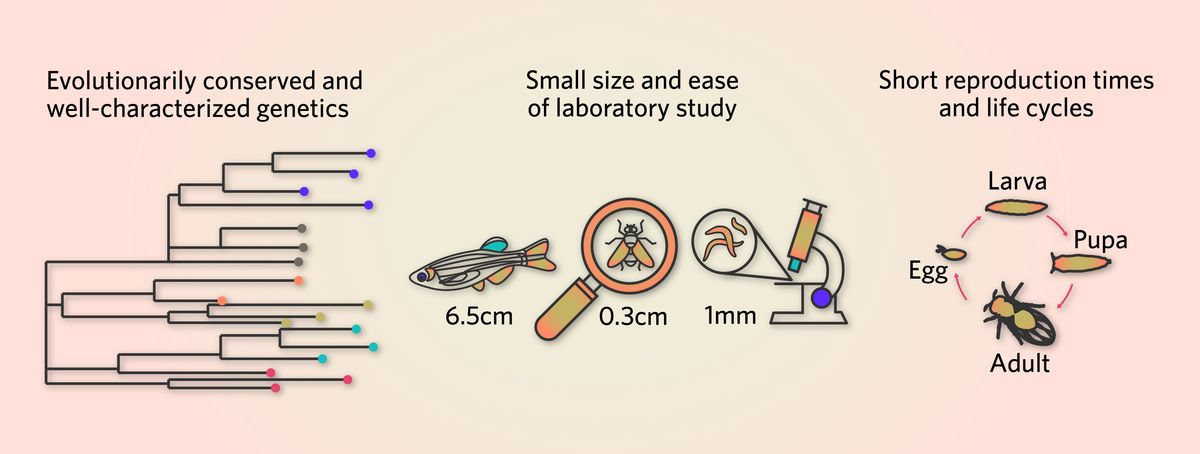 Good model organisms often meet several criteria beyond evolutionary relatedness to humans, including ease of study and universal applicability across laboratories; available and stable genetic information that allows scientists to culture or rear organisms consistently without genetic drift; and available genomic and transcriptomic resources, including editing tools to modify, remove, or add target genes.1 Small size, short reproduction times and life cycles, and financial convenience also inform which organisms are well-suited for researchers seeking model systems.1